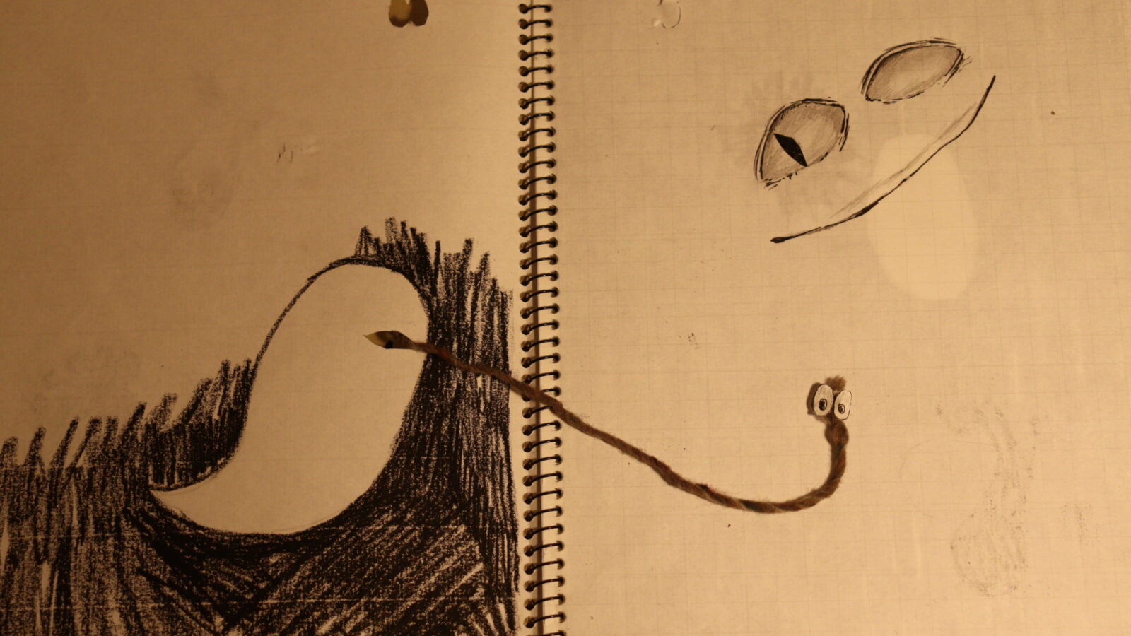 子どもの頃から親しんできた画材や道具、クラフト材料、シンプルな技法を用い、ストップモーションを駆使して、毛糸のミミズ(オバケ)がスケッチブックの中で繰り広げる楽しい作品。テクスチャーを楽しめるクリエイティビティーの高い作品で、「次のページでは何が起こるのだろう」というワクワク感がある。一見素朴だが、アートの世界と子どものクラフトの世界を、豊かで自由な表現でつくり上げている。