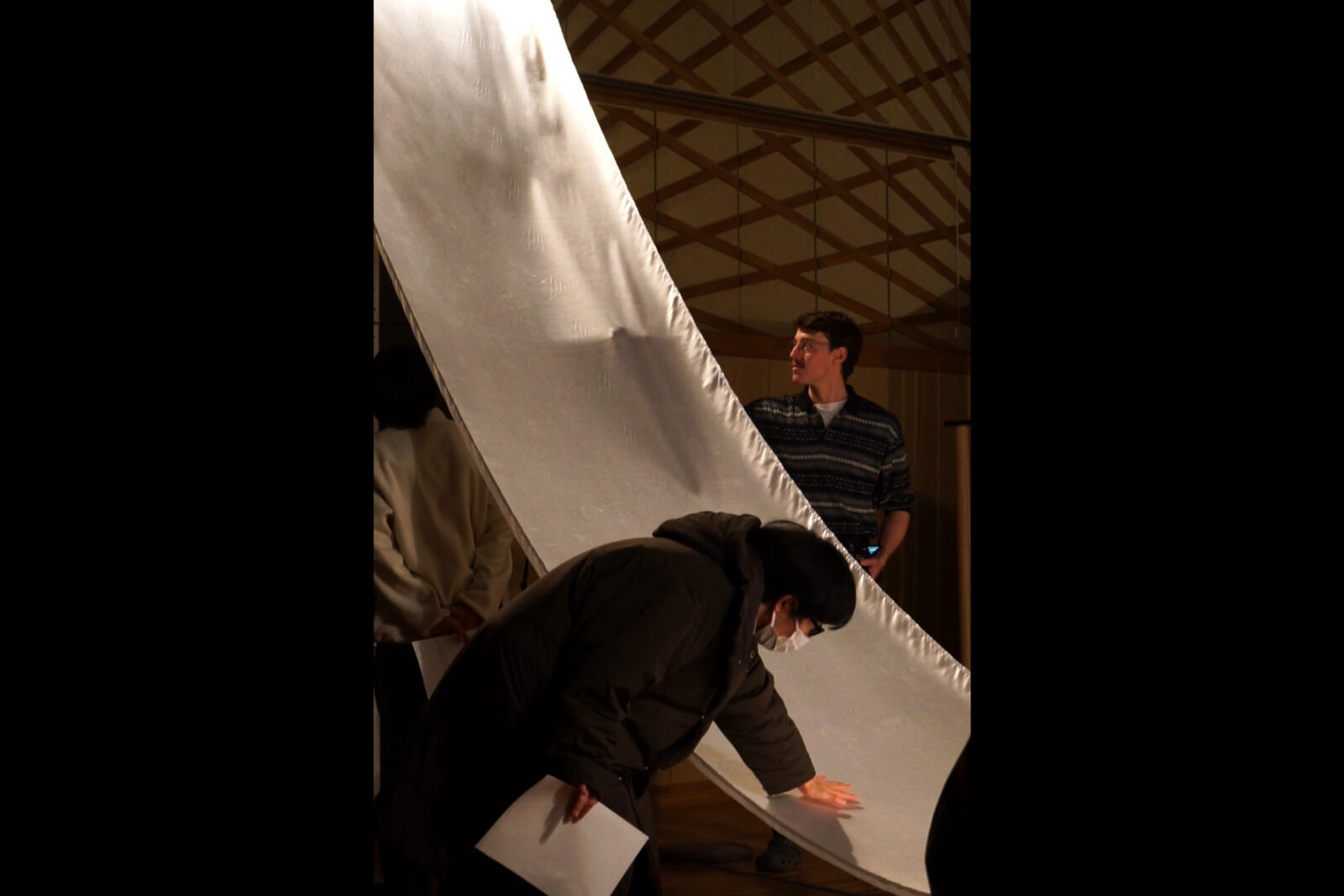 布は、私たちが日々まとい、触れている、とても身近な物質です。けれど、それが大きくなればたちまち重量を増し、平面であるがゆえに、かたちや動きを思いどおりに制御することは決して容易ではありません。ましてやそれをモーターという機構で駆動し、微細な心音を可視化しようとするなら、相当の工夫と、繊細な設計が要るはずです。それを、いとも軽やかにやってのけてしまう。そこには、この表現に真摯に向き合い続けてきた時間と、数えきれない試行錯誤の厚みが感じられました。