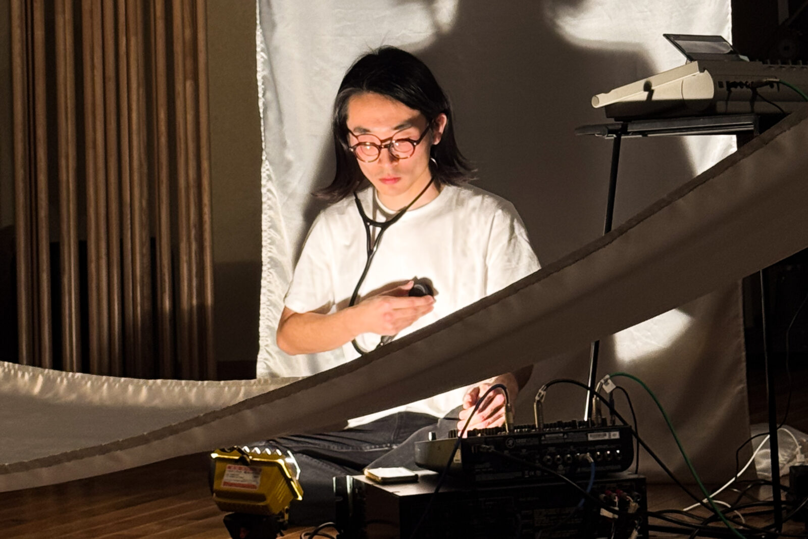 聴診器で捉えられたパフォーマーの心臓音は、布スピーカーによってリアルタイムに再生される。布スピーカーは、心臓音の低周波信号をDCモーターに入力し、その振動によって布を揺らす独自の音響装置である。鑑賞者は布に触れ、そのはためきに耳を澄ますことで、変化する鼓動の音とリズムを身体的・視覚的に拡張して体感することができる。