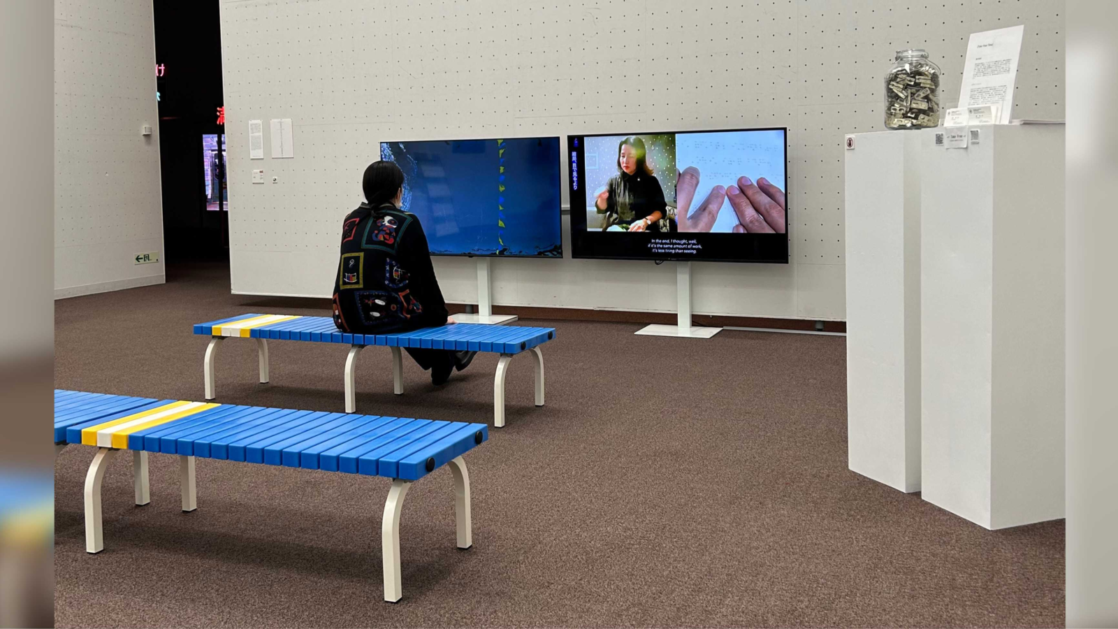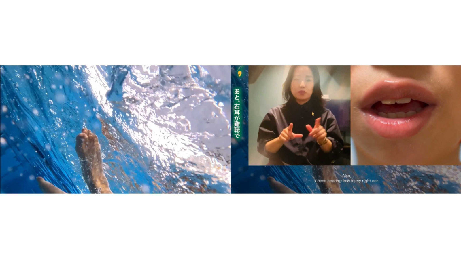 映像は口文字、手話、点字を含めた様々な字幕と泳ぐ映像。水中で息を吐く間だけ作者のメモの言葉と身体障害者3人が話す私生活についてのインタビューの声が聞こえる。普段、聴き逃してきた声から想像してみてほしい。