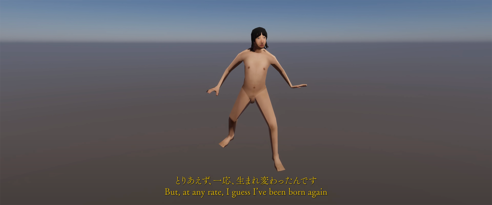 日本神話の火の神様「カグツチ」の誕生に始まり、人間と自然の成長から地球外生命体に至るという、スペースオペラ的作品である。ゲームエンジンの質感が「古事記」を現代的バーチャル感のなかで展開させるが、鍵は「シミュレーション」の概念である。裸のままの主人公がユニクロを履くのも、人類が宇宙へ移住するというストーリーも「シミュレーション」としては同一の現象。そして、地球外生命体となった人類の末裔が、かつての地球をシミュレートしているのが、この作品という一種の円環構造をもつ。過去と未来をつなぐ記憶の在り方をメタ構造にするシナリオはよく考えられており、迫力のヴィジュアルに対して脱力した独特のユーモアが光る、ユニークな力作である。